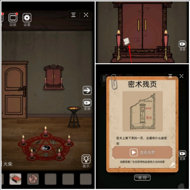将拿到的红蜡烛,跟五毒按照秘术摆放到法阵上,并且用火柴将蜡烛点燃,开启法阵,得到秘术残页