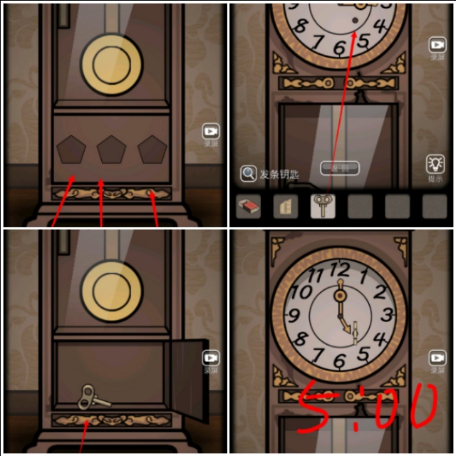 根据秘术残页的指示回到一楼,将木块放入钟表,得到发条,安装发条,将时间调整到秘术指示的时间