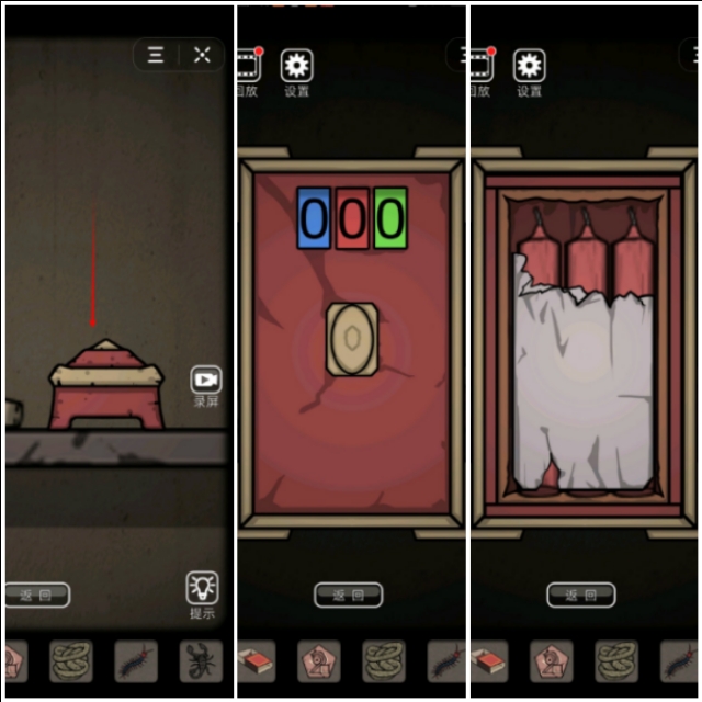 转换场景有一个柜子一个火炉,玩过小游戏打开三个柜子得到鼓,一个矿石,一个密码线索(红色5、蓝色2、绿色1),一个面具,一瓶子苍蝇(打开瓶塞放出苍蝇)。