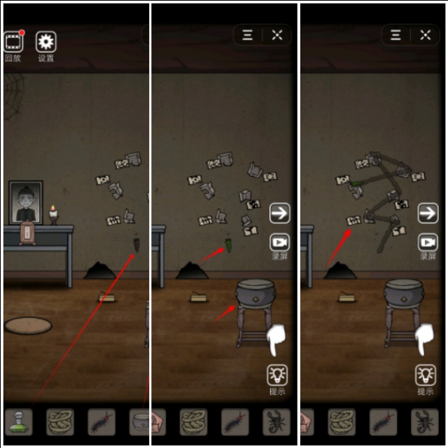 将虫子培养液喂给虫子,将鼓放在鼓架子上,点击鼓玩完小游戏得到线索
