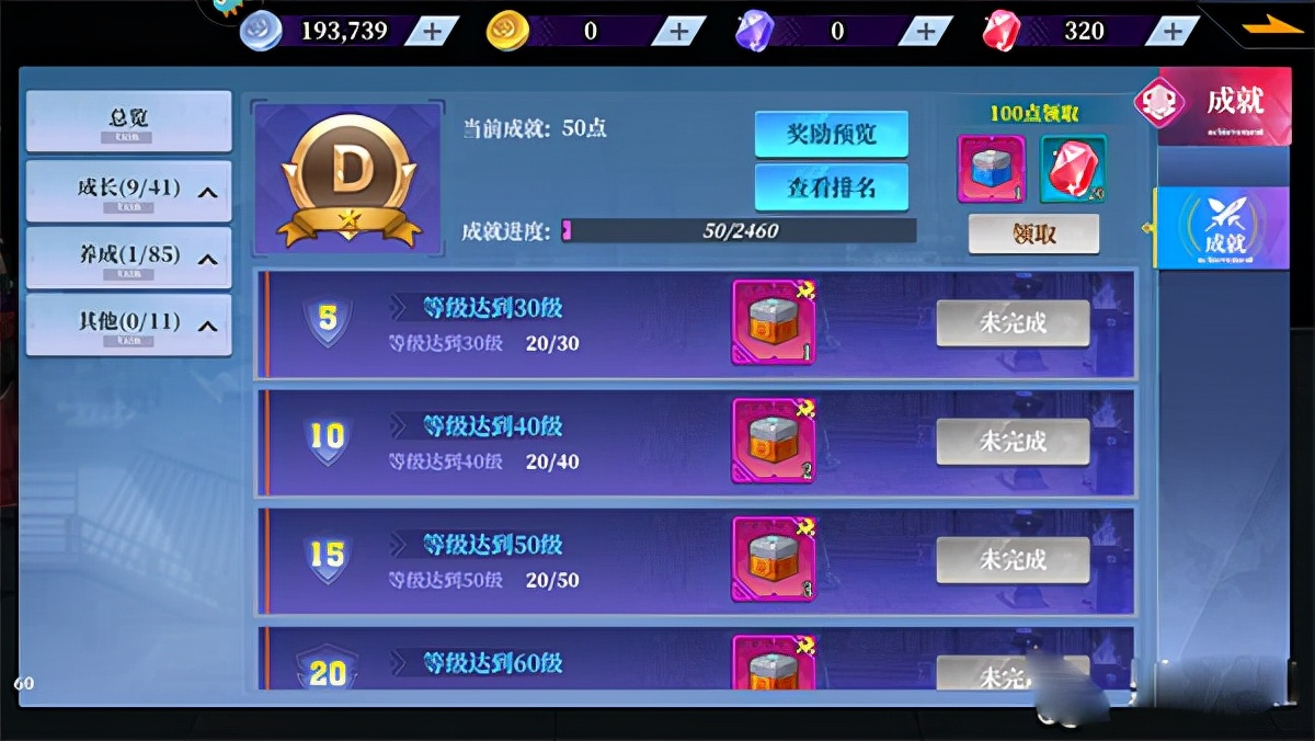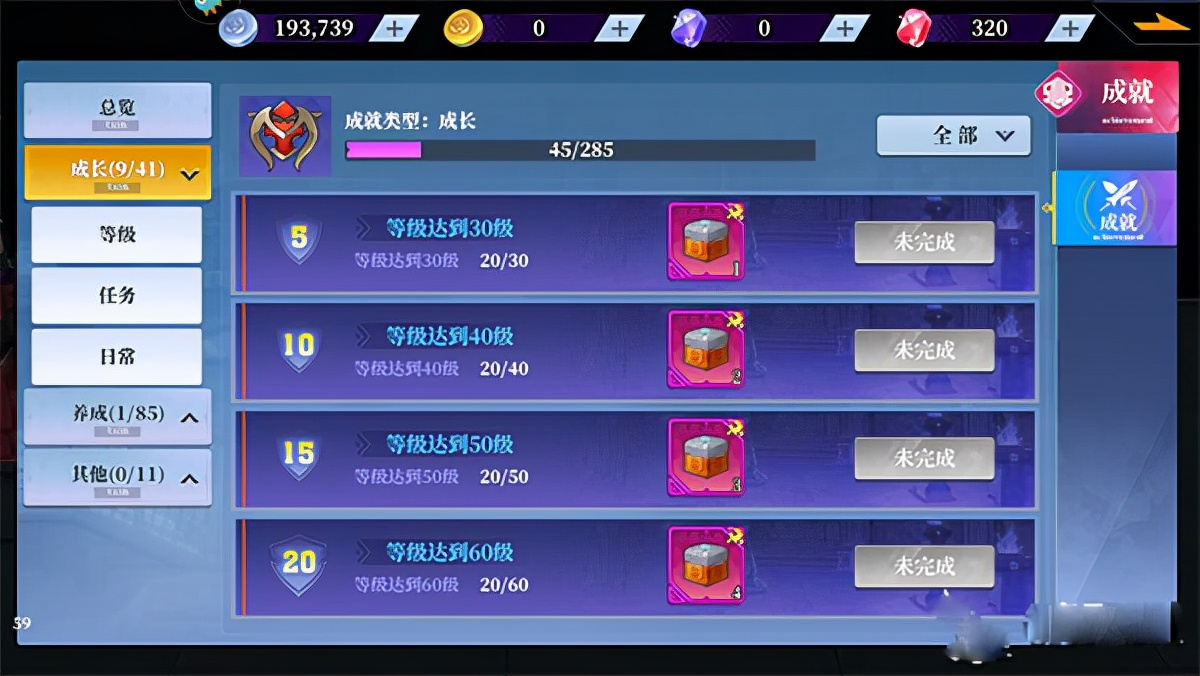 在成就系统中会对玩家的游戏进行评价,会根据不同的评价给予奖励,另外成就内容总分为成长,养成和其他三大类。成长系统中分为等级,任务和日常三大块,等级系统随着我们的等级提高到相应的要求就可以获得奖励,一般是宝箱碎片,收集满10个宝箱碎片可以去传奇之路兑换一个宝箱进行解锁。任务当中的要求就比较多了,完成各种挑战和副本后可以达成成就。日常类都是有数量要求的任务,比如完成20次佣兵委托等等之类的任务。