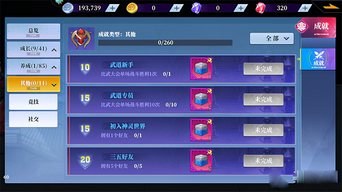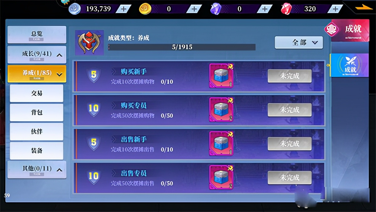 养成成就系统中又分为交易,背包,伙伴装备四大类,主要就是各类和交易物品相关的成就需要完成,伙伴的等级提升等等。其他类主要是竞技和社交,完成比武大会即可获得成就,社交是根据好友之间的互动情况来获得。