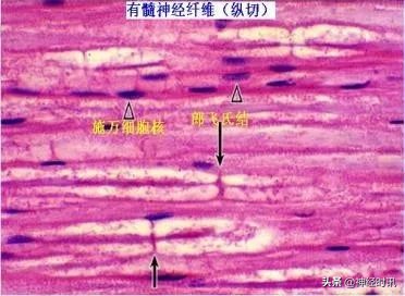 1.有髓神经纤维:周围神经系统中的有髓神经纤维,由施万细胞包绕神经元的长突起(轴突)形成。多个施万细胞包绕一条轴突形成节段性分布髓鞘和神经膜。相邻节段间无髓鞘的缩窄部位,称郎飞结。相邻郎飞结之间的一段神经纤维称结间体。
