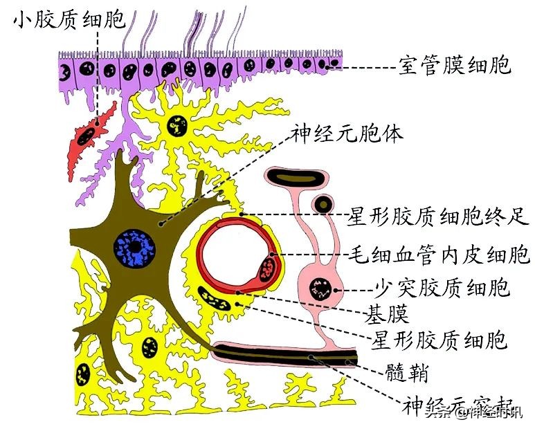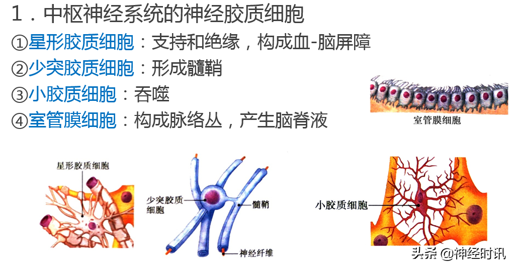 4.室管膜细胞:被覆于脑室和脊髓中央管腔面,呈单层立方或柱状,形成室管膜,可产生脑脊液。