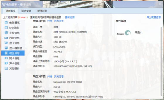 硬盘:1T老硬盘,我手动改装到了光驱位,自己在原位置加装了一块512缓存250G三星固态。