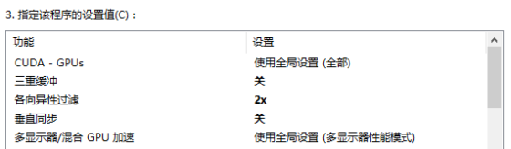 设置:2X。我的是2X-16X,8X CSAA-32X CSAA,各档位全部试过,没有明显变化(渣显卡的事吧),注意一下,CSAA的优化要比单纯的X优化要好,比如8X CSAA优于8X,更节省性能。