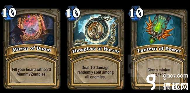 1、Mirror of Doom,召唤数个3/3的 Mummy Zombles(木乃伊、僵尸),直到你的随从数量达到上限。(类似黑龙公主的小龙)