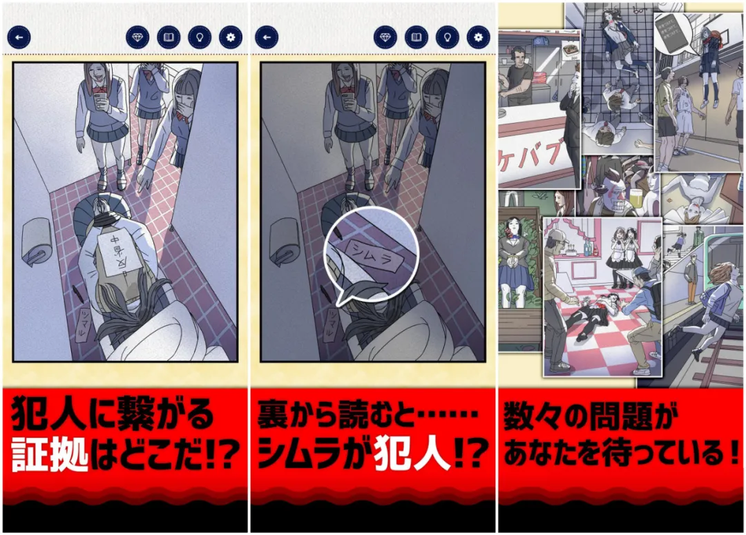 这款游戏的整体设计画风偏向暗黑风,为营造神秘的氛围,整体的背景画风都略显阴暗,每个角色的肤色、发色都形容枯槁。不过场景下面却以鲜艳的红色作为底色,黑白的提示大字,使得整体有着强烈的视觉冲击力,色彩使用大胆的同时却丝毫不突兀。而且作为一款推理游戏,玩家们需要在3分钟时间内找到案发现场发现的线索,再进行推理完成不同的关卡任务,这样争分夺秒的刺激感,推理沉浸感和体验感大大的提升。