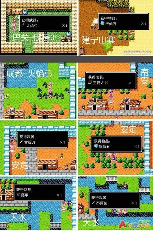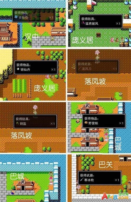 寻找隐藏的宝物:在游戏中,除了在三面包围的地方可以找到宝物外,在城角、陆地的边角、森林所夹的道口等两面被围的地方也可以找到宝物。比如:棉竹的青龙甲,巴关的冰枪,巴城的野营帐,天水城的连打剑,荆州的铁剑,桂阳的铁盔,桂阳西边森林的智复丹,武陵的钢矛,南郡的钢甲。只要你细心点在城里找,你可以发现很多宝物的。详见下图: