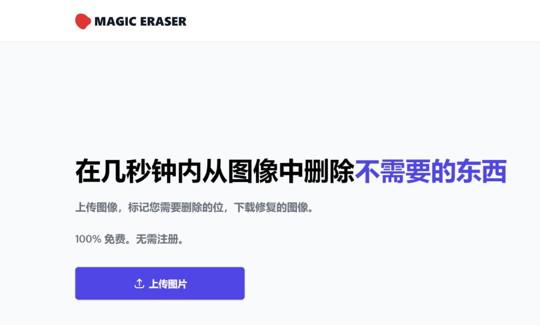 还真有这样的工具,接下来介绍两款一直在用的工具,这两款工具都是基于网页端,哪个平台都能用。先来看看这款叫做 MagicEraser 魔术橡皮擦的工具,在打开网站之后首先看到的就是100%免费,无须注册,而且干净到就剩下一个主要按钮,同时给出了几个示例。