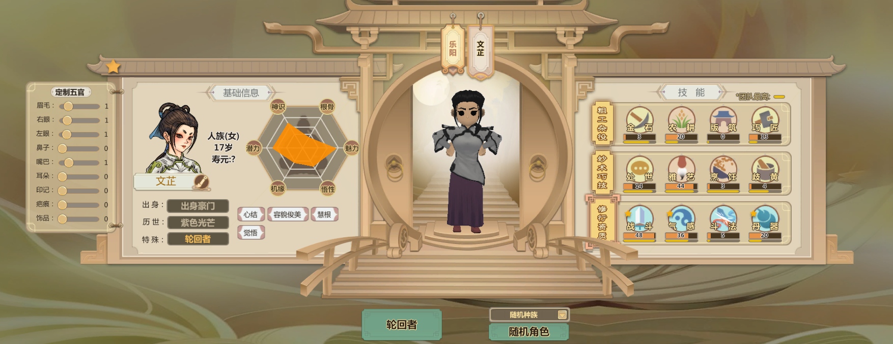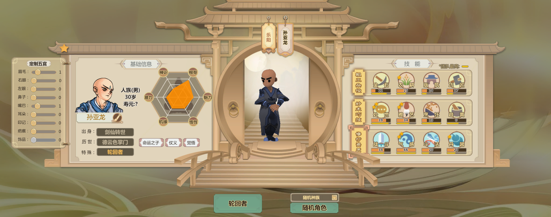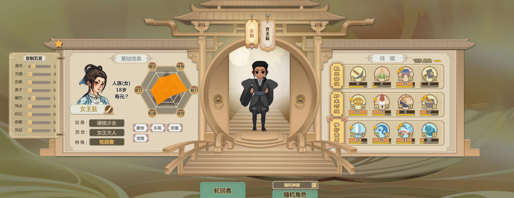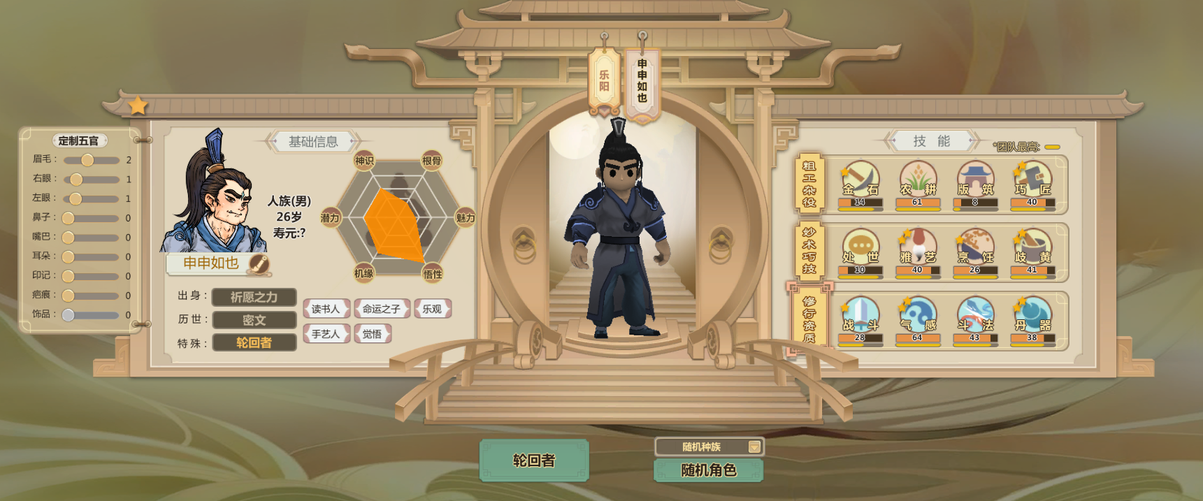 申申如也,高机缘高悟性还有命运之子,巧匠雅艺歧黄都很高而且热爱程度两星(升级更快)气感斗法丹器很高