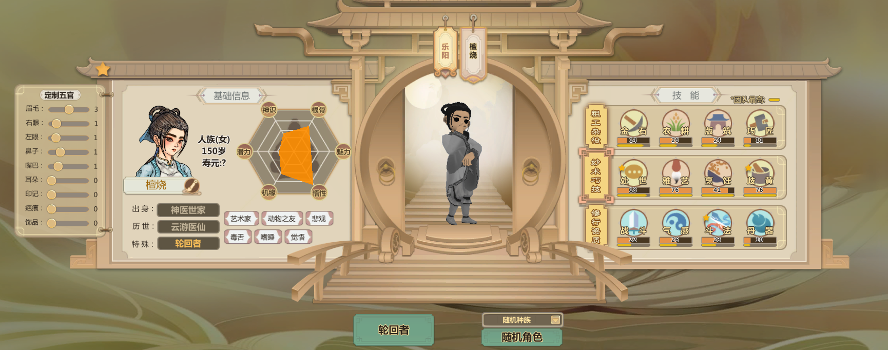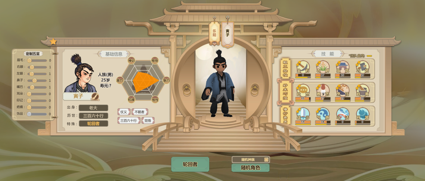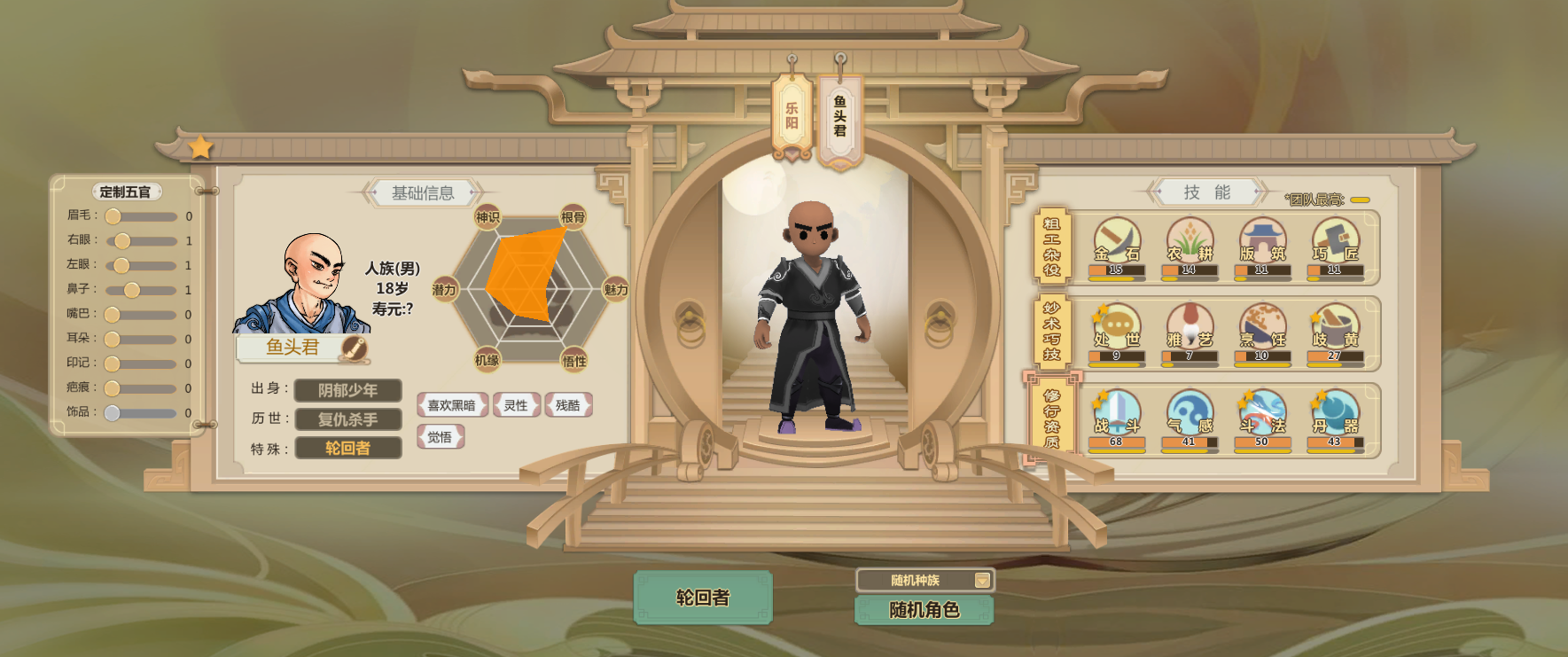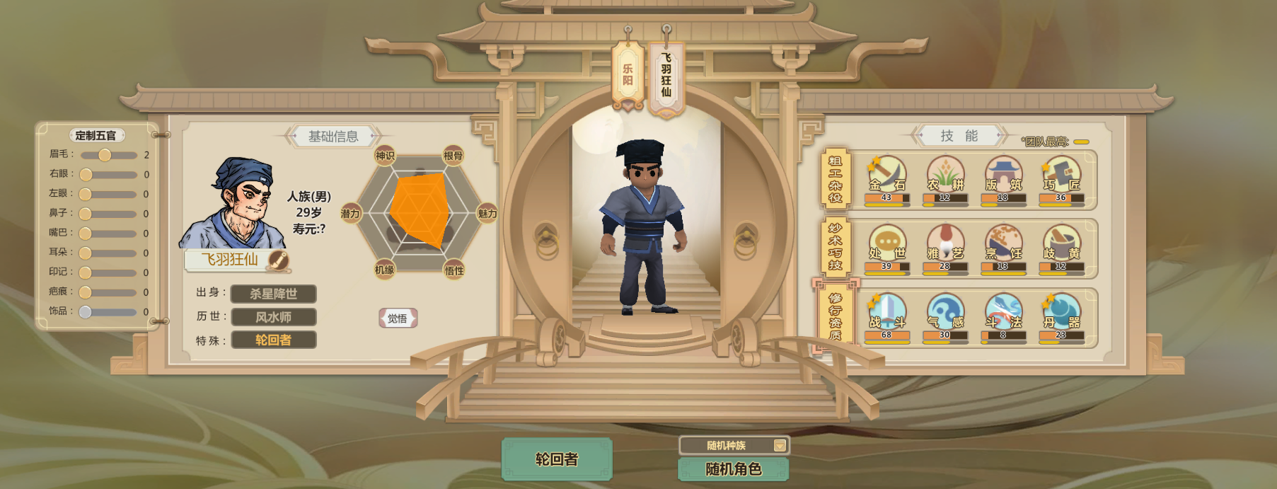 申申如也,高机缘高悟性还有命运之子,巧匠雅艺歧黄都很高而且热爱程度两星(升级更快)气感斗法丹器很高