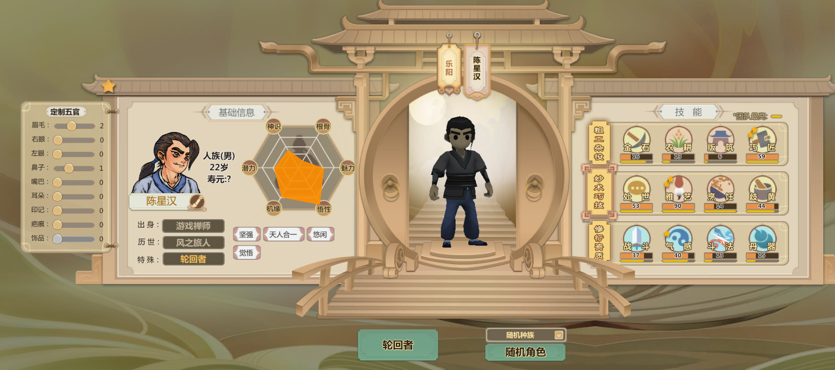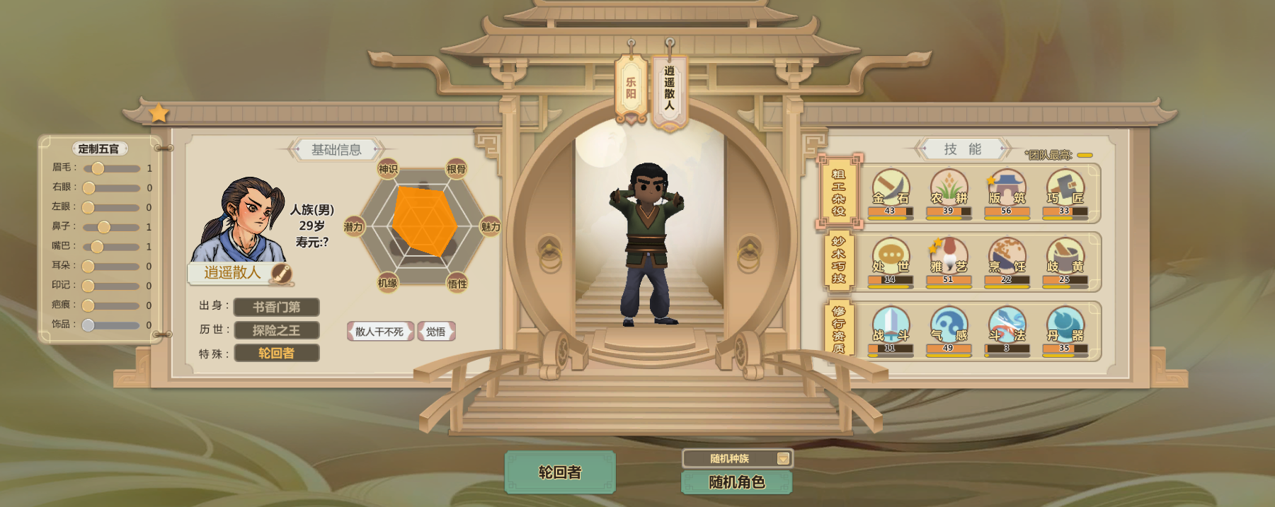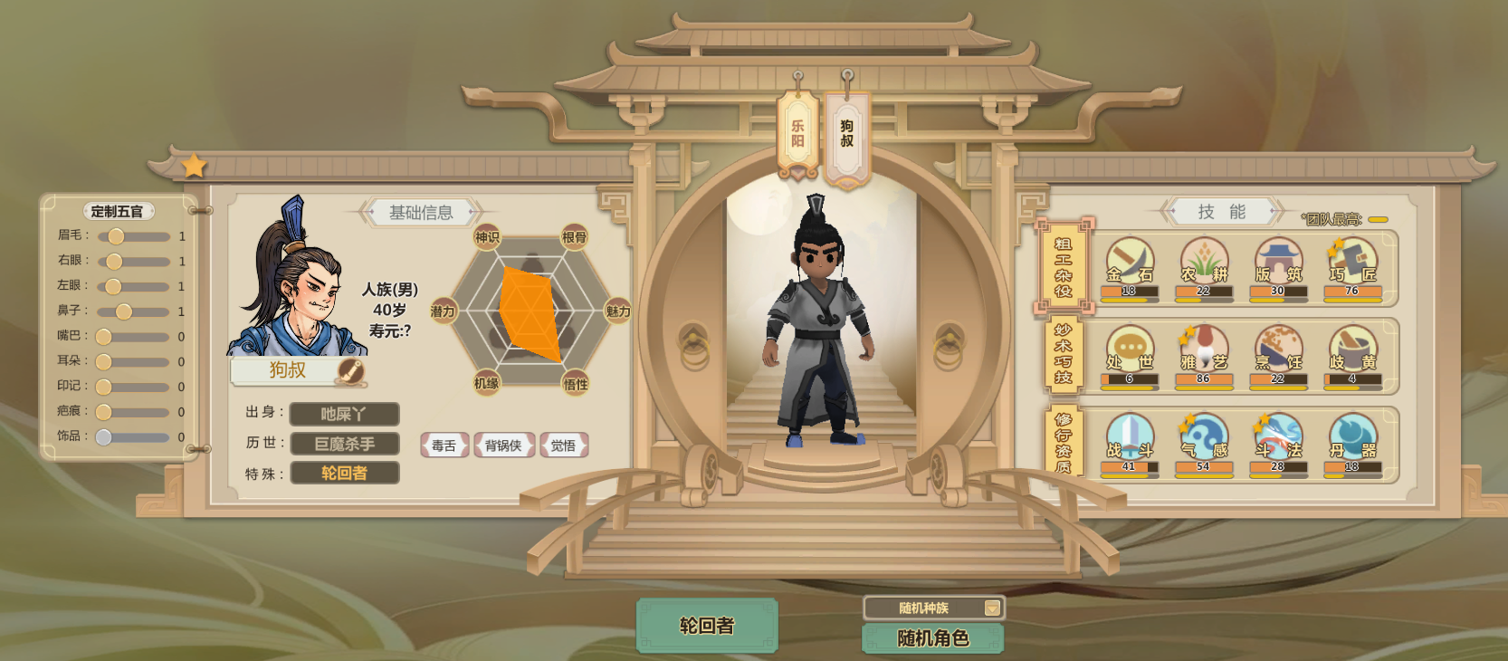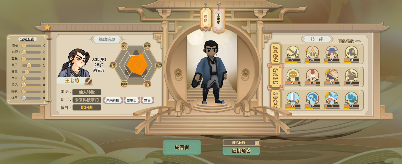 申申如也,高机缘高悟性还有命运之子,巧匠雅艺歧黄都很高而且热爱程度两星(升级更快)气感斗法丹器很高