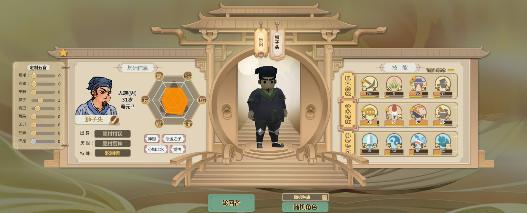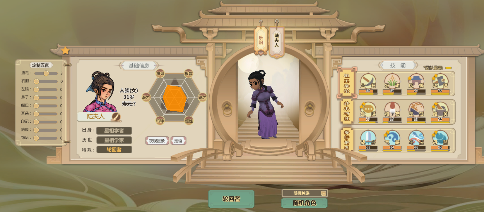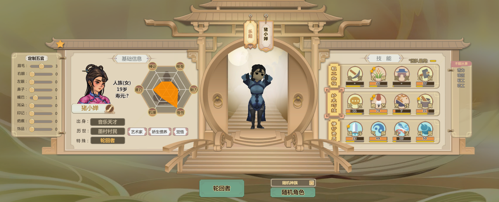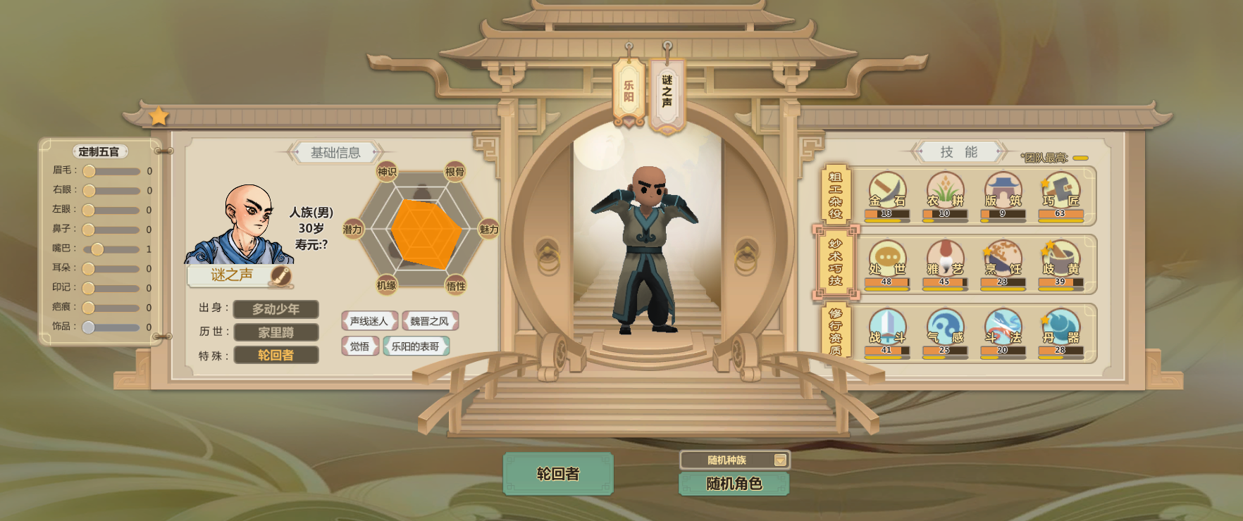 申申如也,高机缘高悟性还有命运之子,巧匠雅艺歧黄都很高而且热爱程度两星(升级更快)气感斗法丹器很高