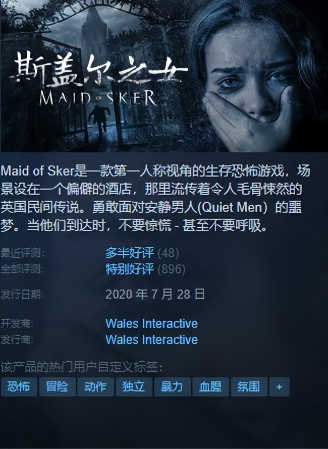 2020年7月28日登陆Steam平台的《斯盖尔之女》是一款第一人称视角的生存恐怖游戏,围绕着现实中1898年的斯凯尔大宅(Sker House)之内及其周边,这座建筑至今仍然屹立不倒,据说是英国最闹鬼的地方之一。