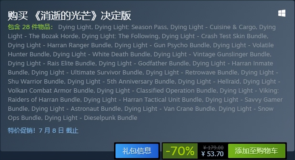 决定版-70%,折扣价53.70元,其中包含所有DLC和季票内容,非常划算。
