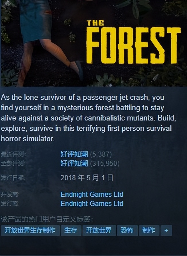 2018年5月1日登陆Steam平台的《森林》可以说完全是一匹黑马,对于沙盒游戏玩法和恐怖氛围的烘托,同时又可以多人合作游玩,真心是做的淋漓尽致,绝对值得入手的一款恐怖游戏。