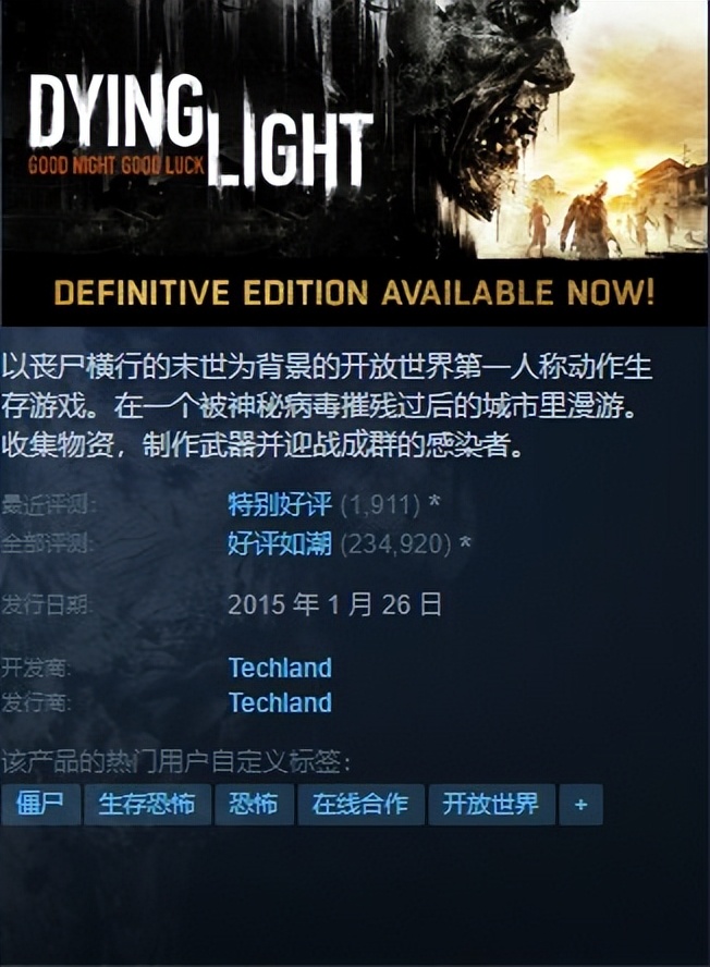 2015年1月26日登陆Steam平台的《消逝的光芒》相信不用多做解释,作为丧尸恐怖类游戏的精品良作,以丧尸横行的末世背景为题材的开放世界游戏玩法,现如今的决定版绝对值得等等党们入手一波。