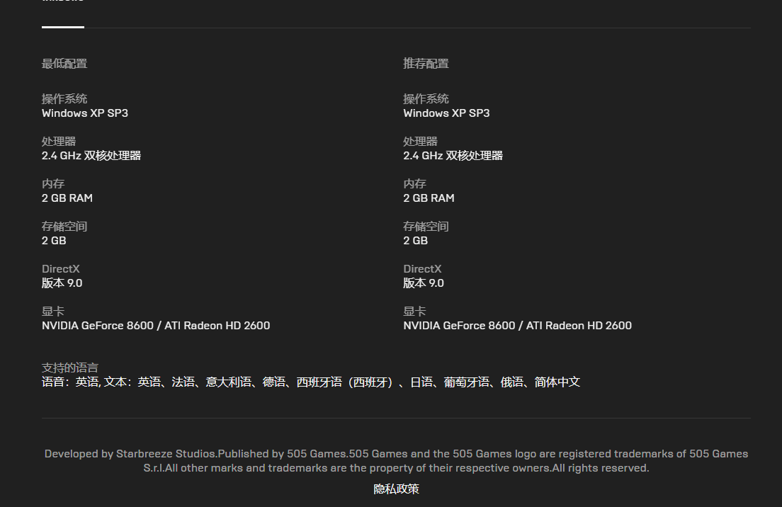 作为近十年前发售的游戏,在配置方面的要求可以说是非常低,大家应该都能无压力运行,反而兼容性才是更需要担心的地方。虽然在epic商店以英文显示,但游戏文本是支持简体中文的,可以安心食用。