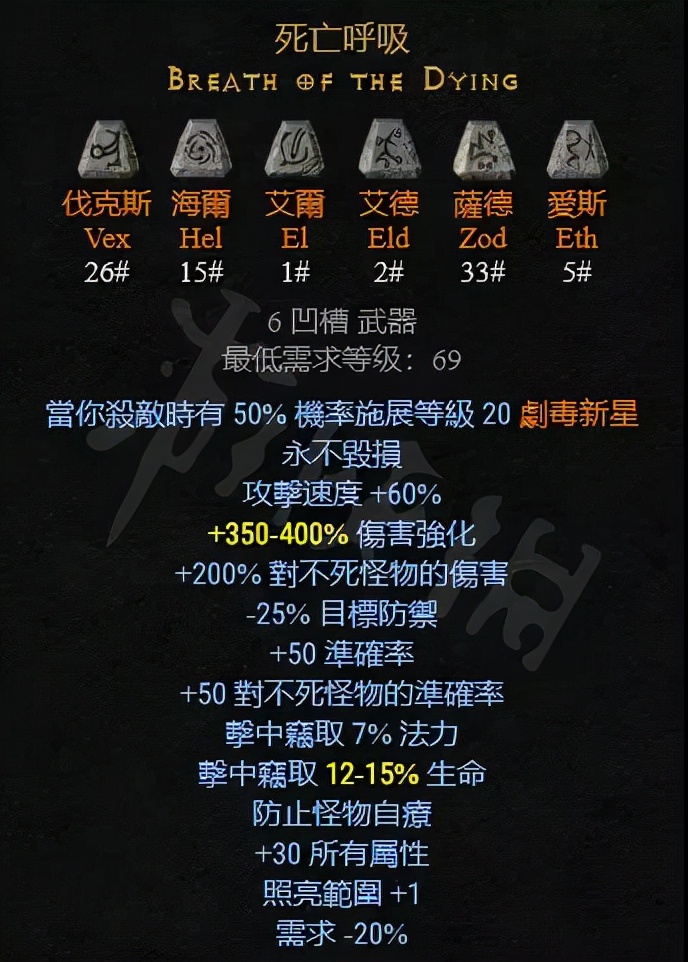 底材的选择:六孔的无形精英级底材,带有特等词缀高ED的狂战士斧之类的,只能任务打孔出6孔,一般不会专门为了死亡呼吸去刷底材,只有这种丢了可惜,又没办法制作无限悔恨的底材,才会考虑制作死亡呼吸,