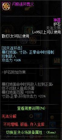 护石分析:略微鸡肋的技能优化,主要是降低了技能的操作次数,变为只按一次就直接释放不用最佳按平A键,攻击力提升小,综合提升率不大,不推荐作为毕业护石选择。