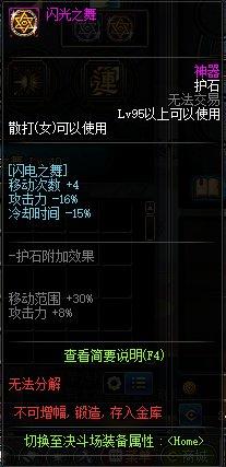 护石分析:攻击次数增加,移动范围增加,间接地提高了技能的输出,提高攻击次数的增加所造成的攻击时间延迟其实可以忽略不计,因为本身CD就短的原因,CD的减少进一步强化了这个技能,综合提升率大,强烈推荐作为毕业护石选择。