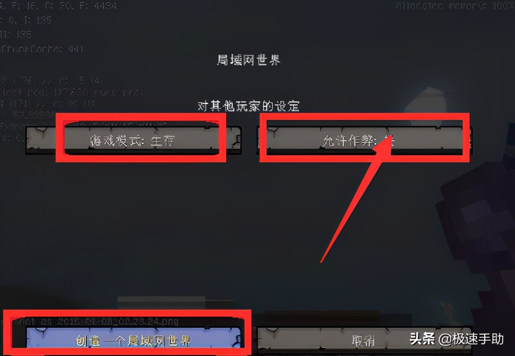 第一步,当然是打开并登录游戏账号,进入到我的世界游戏界面中,点击【设置】进入设置页面,选择游戏模式为【生存】,并【开启允许作弊】,最后点击左下方的【创建一个局域网世界】按钮。