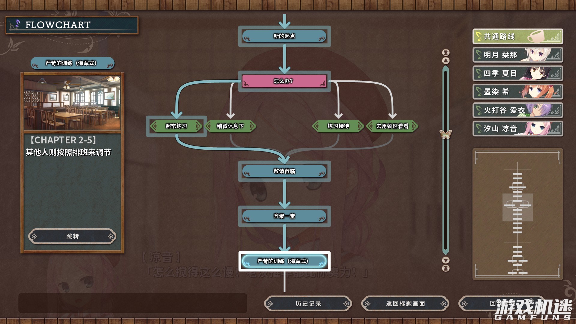 本作的UI我认为还是很棒的,由于剧情分为共通线与个人线,且存在大量的分支选项需要选择,才能推进游戏的进程,解锁各种结局,所以一个好的UI界面并不可少。为了让玩家更好的推图并解锁新剧情,游戏中的流程图会让你认清自己的位置;其次在你通关某一结局后,需要重新通共通刷另一个结局时,除了众所周知的SL大法外,跳到下一个选项和skip可以帮你越过很多你已经浏览过的剧情,让体验更加效率化;最后还有一些额外的人性化功能,比如照相机按钮就可以快速保存截图到本地。