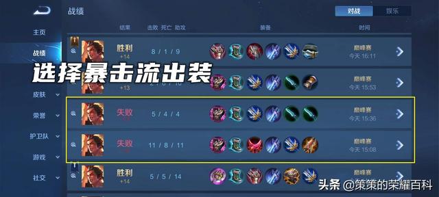 通过最近的巅峰赛,我挑了比较有代表意义的五场数据,可以看到测试的战绩为三胜两败,且败场均为准备选择暴击流出装打法。