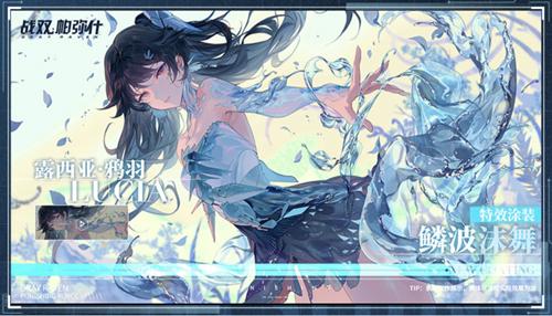 第一件涂装露西亚·鸦羽专属的特效涂装【鳞波沫舞】,片羽化鳞,点缀了露西亚的脸颊与躯干肌肤,裙摆分为两层,外长内短,一透黑一水蓝,均饰以鱼鳍纹样,荡漾轻盈。