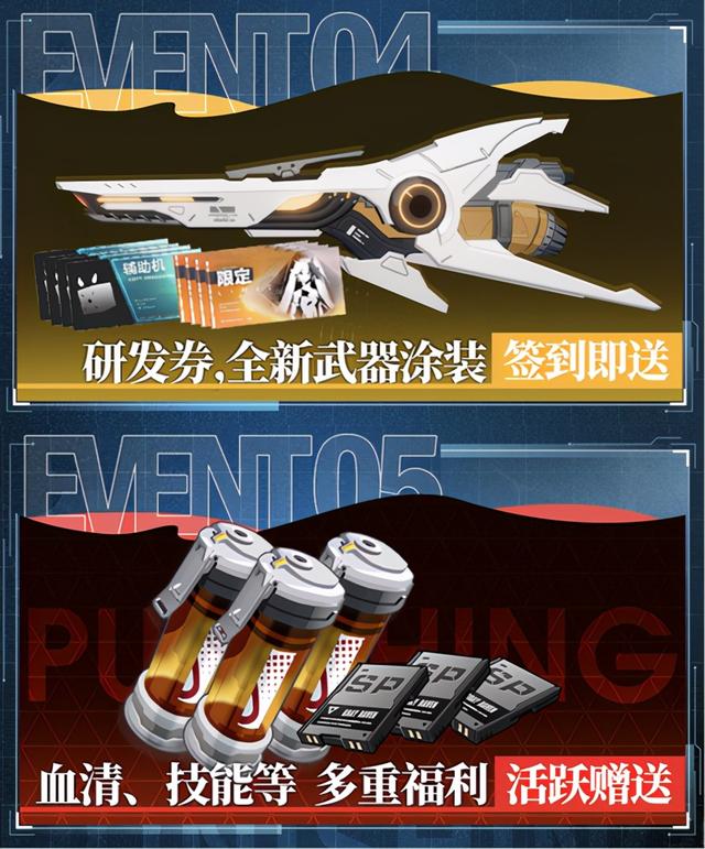 最后,少不了多重福利!除了上述提及的送2款涂装、家具部件外,还有研发券、血清、技能等丰富福利等待指挥官的领取!