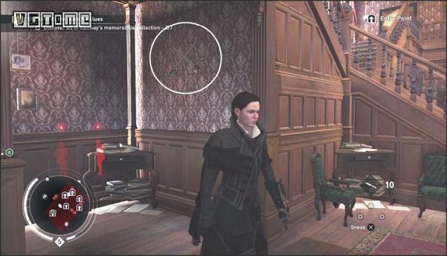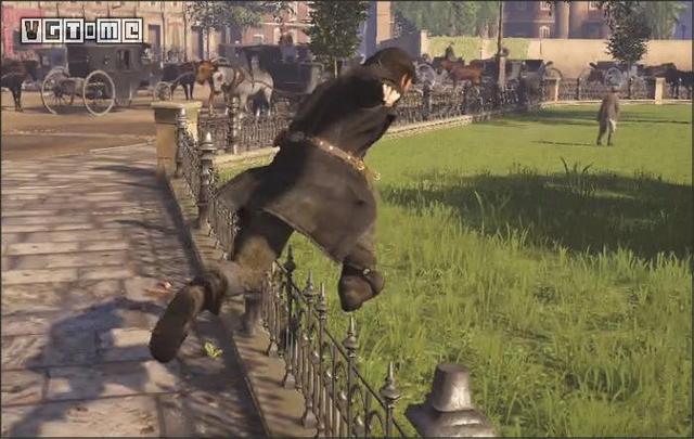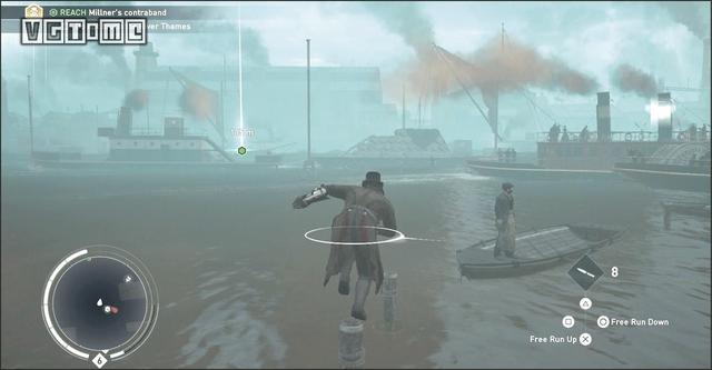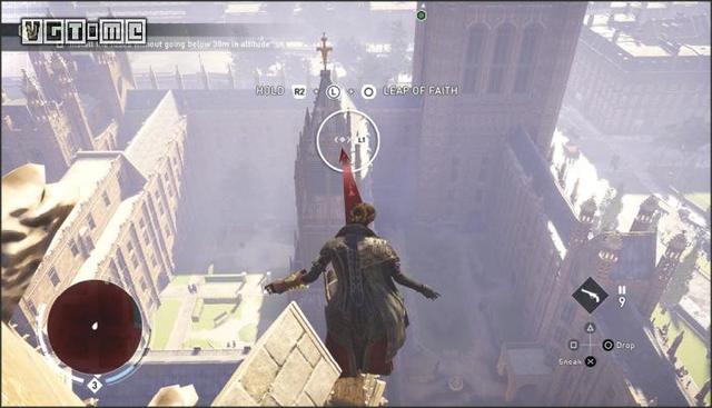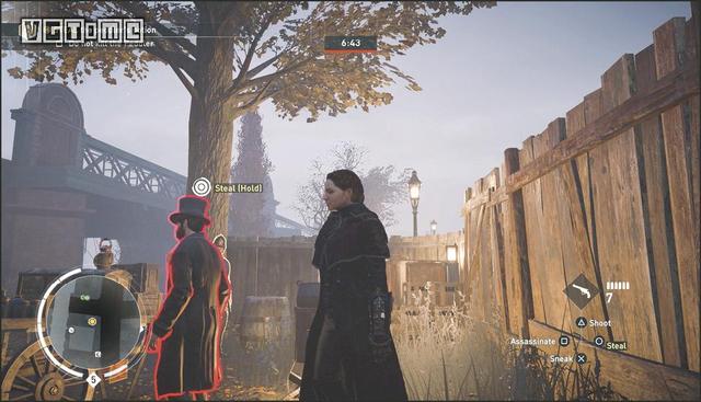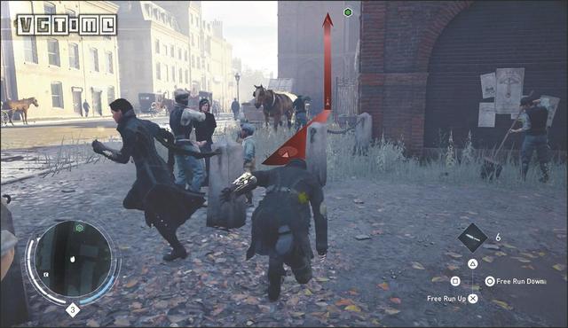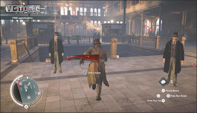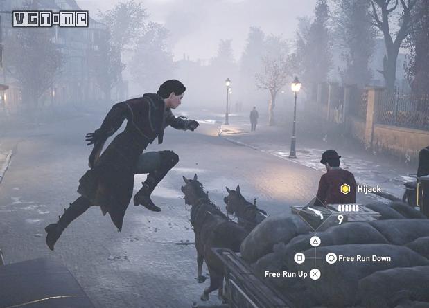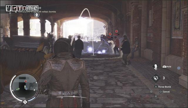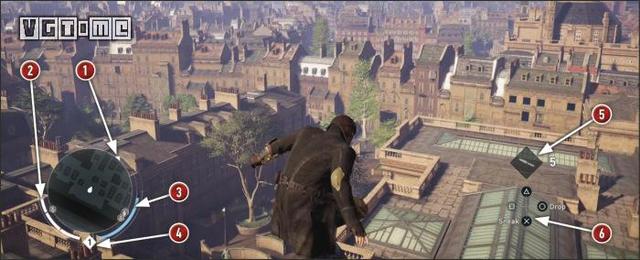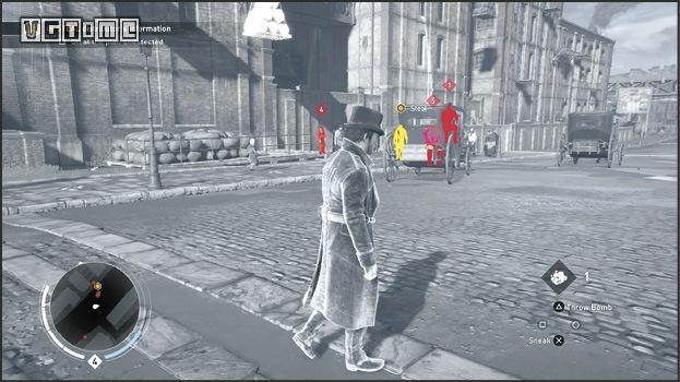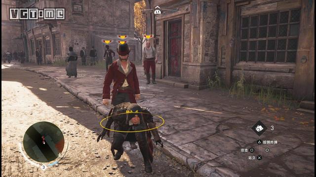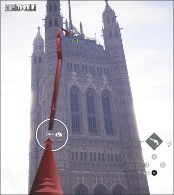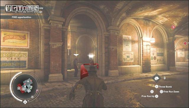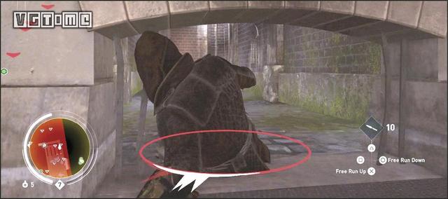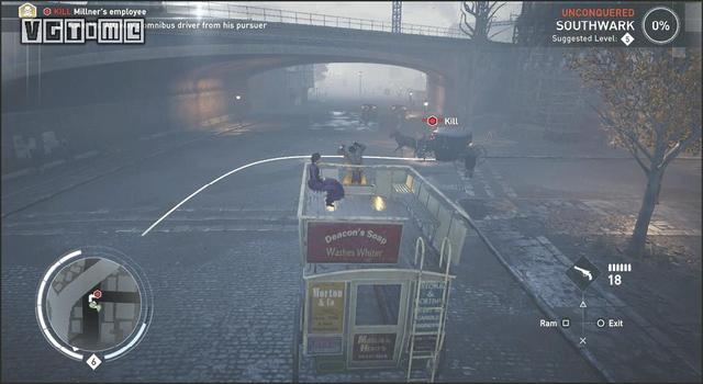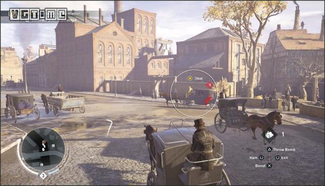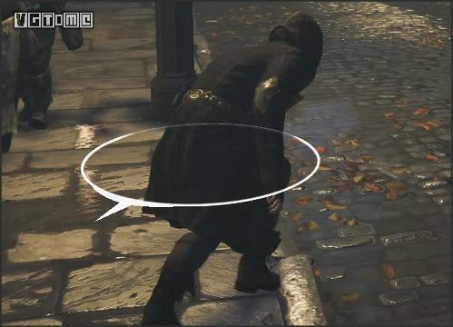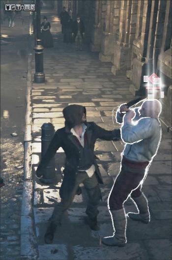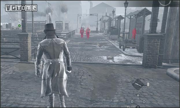在公园外劫持一辆马车,驱车向北,在十字路口处右拐。你会先后从两座桥下方通过,过了第二座桥后立刻减速(需放开×/A和R2/RT),激活鹰眼视觉,把目光转向大街右侧的建筑。在Blighters团伙中标记他们的老大(身上会冒黄光),注意,不要靠太近了,以免被发现。