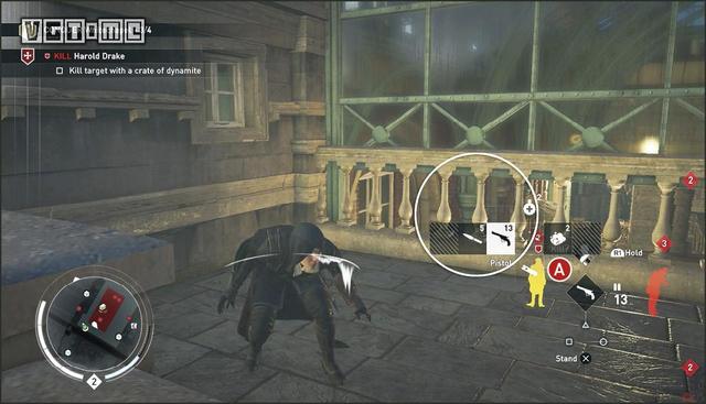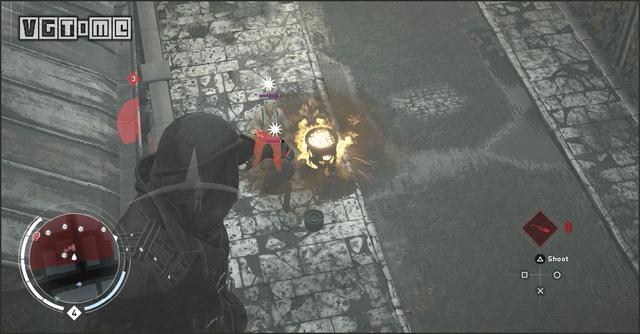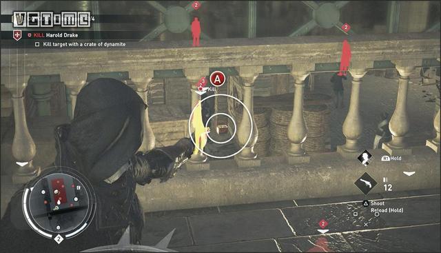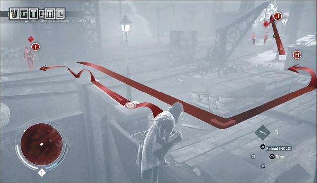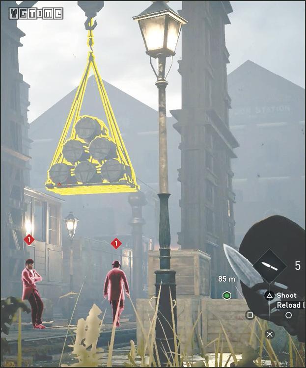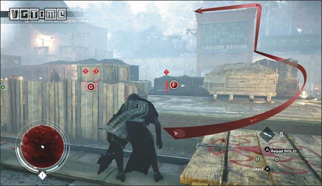如图路线所示,来到克里登火车站的房顶。下面有三个暴徒。应该先解决远处的两个暴徒(G)。他们上方有挂桶,用飞刀击落挂桶解决他们。