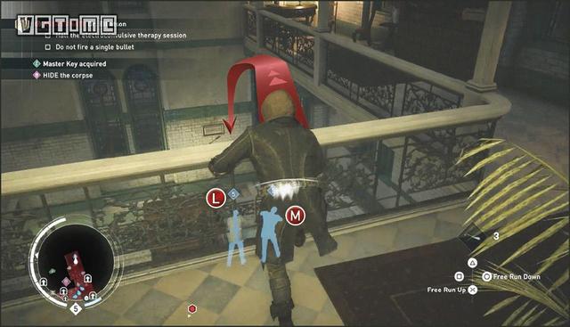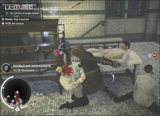按照上图所示的路线,暗杀掉沿途的敌人来到栏杆旁边。可以看到有两个人正在对另外一个人准备使用电击疗法,在他们点击那个人之前从上向下使用空中双重击杀,杀掉两人之后即可完成此挑战。