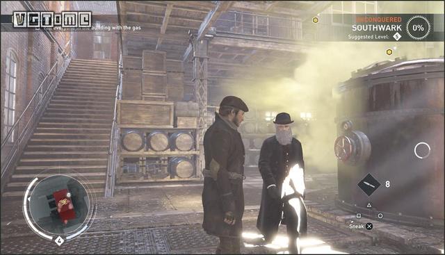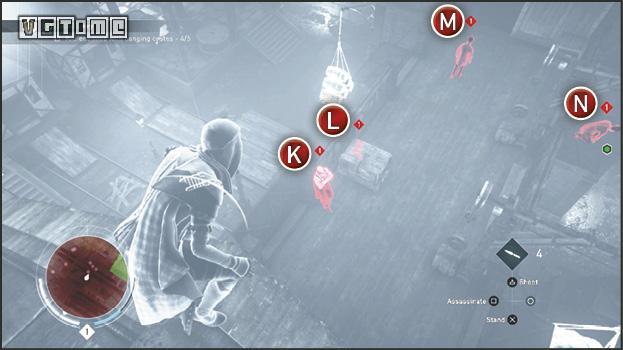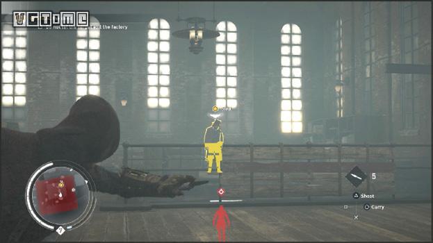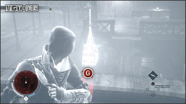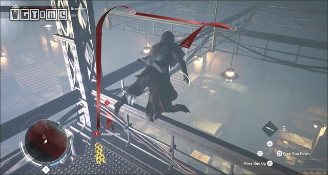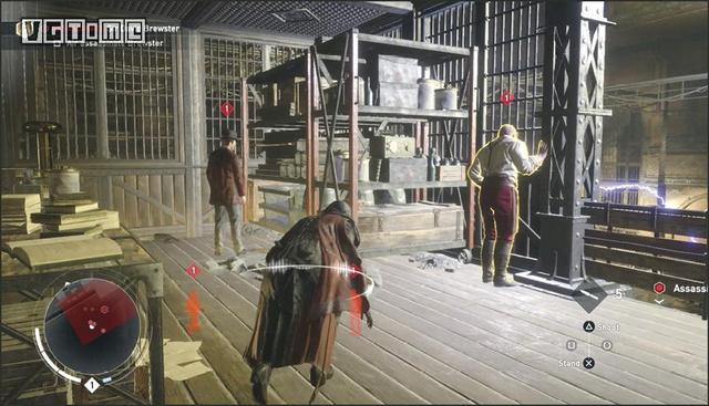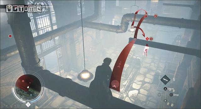 利用鹰眼视觉标记在下面巡逻的敌人(T)。有两个敌人(U和V)可能因为管道挡住了无法标记。他们在远处的二层楼上巡逻。跳过一些管道,在这两个暴徒离开房间以后,跳到灯的顶端,从空中暗杀敌人(T)。爬上大型的机器来到第二层。