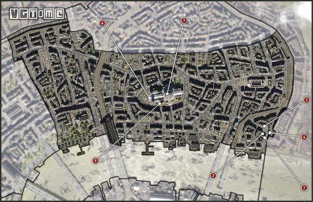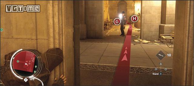在完成刺杀目标之后,金库里的抢劫者应该不会意识到主角的存在。等待直到整个区域的巡逻守卫离开,从图中标识为G的敌人身边溜过,刺杀或绕过标识为H的敌人,向前右转进入过道。一路向南走过通道,穿过左侧唯一一扇打开的门,房间里会有强光,远端的墙下部有一个栅栏,滑铲通过就可以完成秘密通道挑战。