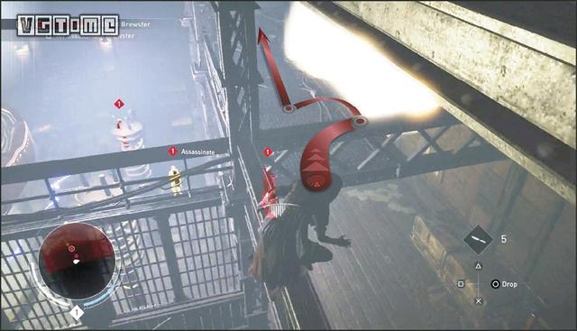 穿过T台,跳到最近的灯架上,沿着灯架向左可以在布鲁斯特的移动路线上空中暗杀他。