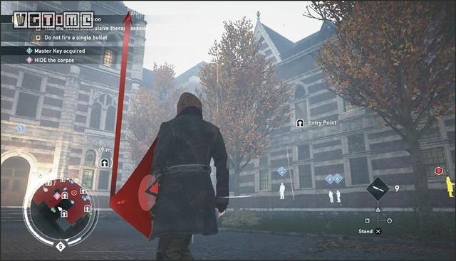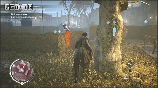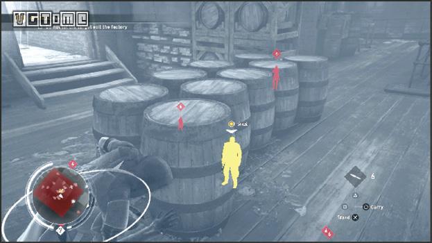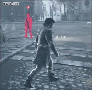 脱离视线:想要逃离冲突并消失,你必须脱离所有对手敌人的视线。要做到这一点,你要可以利用巷弄、快速进入窗户、运用绳枪快速抵达屋顶,甚至还可以利用烟雾弹。一旦脱离视线,最后目击位置的轮廓就会出现。表示现在是躲起来的好时机。