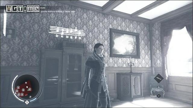 此挑战要求玩家在不错一次的情况下解开钢琴谜题,看似颇有难度,实则非常简单。在屋内使用鹰眼视觉,看到墙上的乐谱显示“D、A、D、E、F、D”。