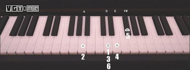 调查钢琴,各个音符所对应的按键会显示在画面中,照着之前“D、A、D、E、F、D”的顺序按键即可。如图,依次按下“□/X、 ×/A、□/X、△/Y、R1/RB、□/X”即可。