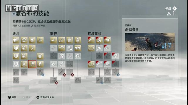 连杀系统:自游戏在二代出现连杀系统后,《刺客信条》险些走上了“无双”的不归路,不少玩家已经懒得准找潜入的方式,往往如绞肉机般强行推进。所以育碧在上一作中大幅弱化了连杀系统的存在感,不过却引发了玩家的巨大不满。于是今年育碧想到了一个还算折中的方法,连杀系统被拆分为两级“杀戮者”技能,玩家需要学习到这两个技能才能开启连杀能力。同时,在使用“杀戮者”技能时,如果敌人成功格挡了攻击,那么连杀就会自动中断。