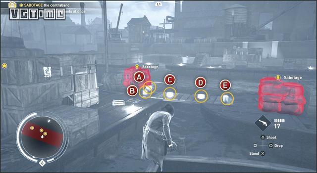 最后两个走私品放得很近,按照上图摆放炸药箱,确保和可以引爆到下一个,之后首先射中间的箱子(C),就可以把两个走私品同时破坏。