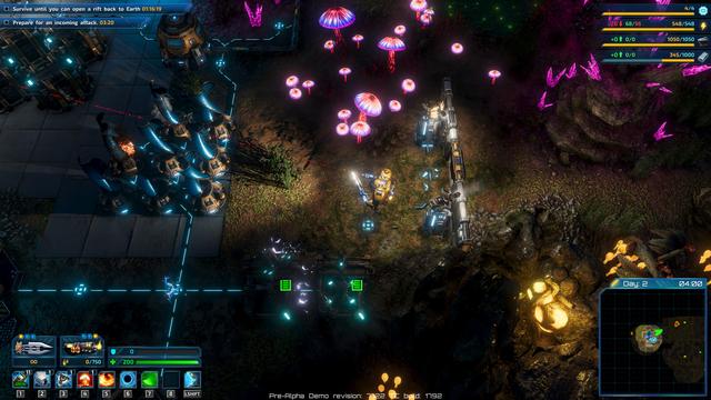 而生存元素,与其说是生存不如说是探索。玩家在经历过初始发展阶段后,为了寻找更多更丰富的资源,必定会前往其他地域,在寻找新资源的过程中你需要扫描异星植物标本,收集各种生物样本和资源样本,还需要时不时地面对不知道从哪里冒出来的敌人的袭击,这时候你就需要一台强大的机甲以及凶猛的武器。当然有些时候你的机器人也必须参与到基地防守之中,所以游戏也包含了一部分RPG元素。