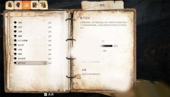 专家级别,合成小游戏拥有2个蓝色零件;大师级别,对话小游戏拥有3个蓝色零件。撬锁:打开被锁住的垃圾箱。你的技能等级越高,在玩撬锁小游戏时获得的修理机会就越多。专家级别,撬锁缩短40%;大师级别,撬锁缩短80%。街头卖艺:乞丐可以在街头上演奏音乐以赚钱。你的技能越优秀,就会吸引到越多观众专家级别,技能的冷却时间降低30%;大师级别,技能的冷却时间降低60%。跪下乞讨:只需要跪倒在川流不息的街道上装出一副可怜兮兮的样子就行了。你的技能等级越高,人们就会越倾向于对乞丐的乞讨行为作出反应。专家级别,技能的冷却时间降低30%;大师级别,技能的冷却时间降低60%。战斗中:你的技能越优秀,你身体所生成的肾上腺素越多。因此可以更快输出强力一击。专家级别,战斗小游戏拥有2个蓝色零件;大师级别,战斗小游戏拥有3个蓝色零件。合成:你可以制造或者修复很多东西,这也适用于烹饪。这种能力也可以扩展你制作的小游戏中的绿色面积。专家级别,合成小游戏拥有2个蓝色零件;大师级别,对话小游戏拥有3个蓝色零件。撬锁:打开被锁住的垃圾箱。你的技能等级越高,在玩撬锁小游戏时获得的修理机会就越多。专家级别,撬锁缩短40%;大师级别,撬锁缩短80%。街头卖艺:乞丐可以在街头上演奏音乐以赚钱。你的技能越优秀,就会吸引到越多观众。专家级别,技能的冷却时间降低30%;大师级别,技能的冷却时间降低60%。跪下乞讨:只需要跪倒在川流不息的街道上装出一副可怜兮兮的样子就行了。你的技能等级越高,人们就会越倾向于对乞丐的乞讨行为作出反应。专家级别,技能的冷却时间降低30%;大师级别,技能的冷却时间降低60%。
