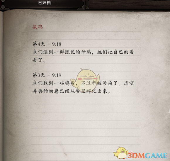 跟一只叫大玛吉的母鸡对话,提给你标注地点,过去后会看到大部分的鸡蛋都已经被用来开孵化虚空虫子了,打破六个蛋和一只大虫子,再往前走会看到一个蛋,这颗蛋已经被虚空感染了,你可以吃掉,回去后会跟母鸡开战,打完任务结束,不吃掉,把蛋给母鸡,过一会儿再回来,发现母鸡都被刚刚孵化的虚空小鸡杀死了,用灵魂透视的技能,可以看见,大玛吉,他让你去找小鸡的爸爸,魔法公鸡,地图上有标注,护送到后,魔法公鸡让你杀死小鸡,杀死之后领取魔法公鸡的奖励,旁边箱子里还有一把不错的弓,应该是12级的,小鸡身上可以摸到一颗秘源宝珠,如果不杀,小鸡会杀死魔法公鸡,然后召唤出大量虚空小鸡,全部杀死后可以摸到3-4了秘源宝珠,数鸡任务全部内容结束。