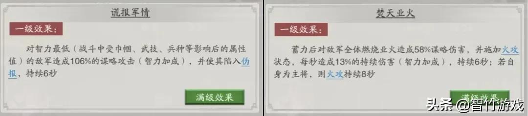 诸葛亮自带的技能可以让我方的技能触发率达到100%,同时还可以对兵力最低的敌方武将追加一次伤害。羽翼丰满可以提升副将的武力智力统率,而兵贵神速可以再次保证我军技能的触发。