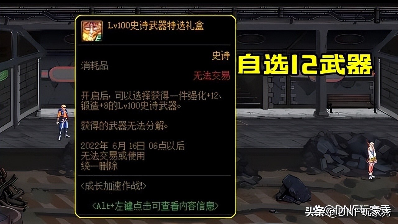 “4.21–6.16”期间的新活动“成长加速作战”,可以“新建一个角色”或者指定一个“未满级角色”参加,当角色达成100级满级的时候,可以直接领取一个角色绑定的“Lv100史诗武器特选礼盒”,打开后可自选获得一把“强化+12和锻造+8”的100级史诗武器,时隔一年,策划终于又开始送+12武器了,爽。
