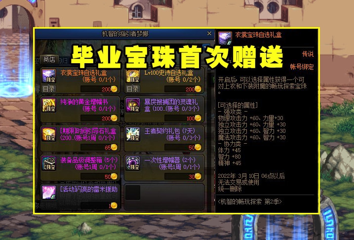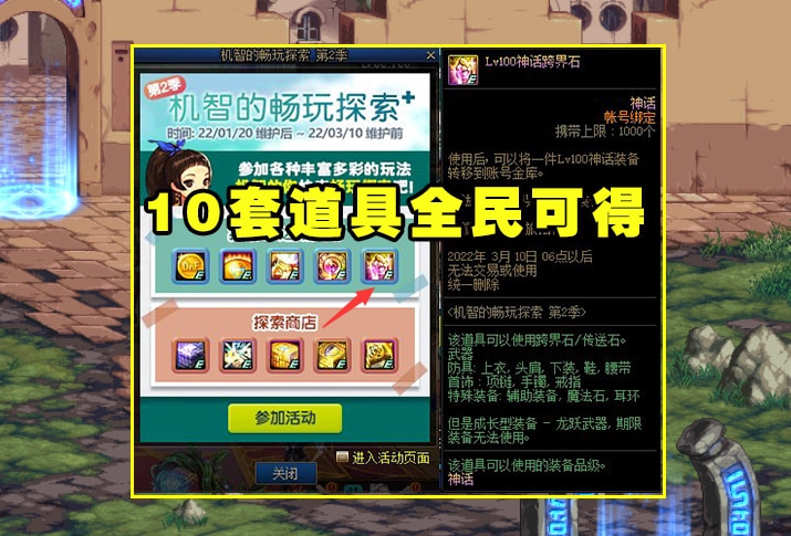 机智的畅玩探索在13周年庆活动中加入过一次,赠送神话罐奖励,还有各种蚊子腿,非常的给力,而在22年的新春版本中也是回归了!这次回归的畅玩探索2.0奖励一点都不输于1.0版本,不仅有1.0含有的神话罐、神话变换凭证,同时还有去年买10套才能获得神话的神话跨界石,而在商店奖励中,玩家还可以获得一个60三攻/30四维的毕业宝珠,简直美滋滋。