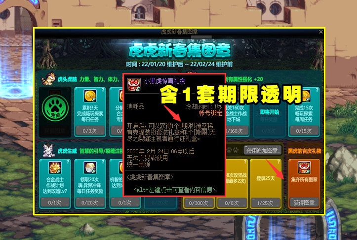 在虎年到来之后,怎么能少了有关虎年的活动,这次在新春版本期间就加入了虎虎新春集图章和虎虎新春来签到这2个活动。其中在虎虎新春图章中,玩家可根据任务完成,并获得指定的奖励,奖励包含畅玩硬币、合金硬币、矛盾等等,其中在集齐所有图章之后,玩家可获得最终奖励小黑虎惊喜礼盒,六合就包含1个有期限的稀有克隆装备套装礼盒,非常的给力。
