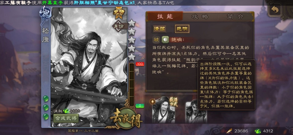 嵇康的技能大家了解么?因为字体比较多,而且拥有此武将的玩家比较少,相信有很多玩家都不太清楚他的技能。嵇康阵亡技能有两段,第一段就是:嵇康在阵亡的时候,击杀嵇康的那个武将需要弃置所有装备牌并失去一点体力;第二段是令一名角色获得“残韵”技能。
